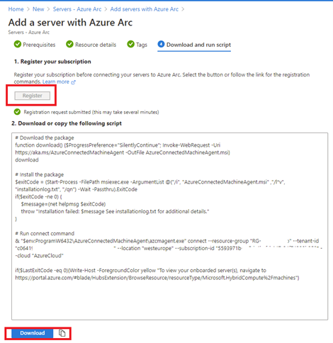 Yeni Sunucu Ekleme Adımları Azure Arc’a yeni sunucu eklemek için; Azure Arc panelindeki “Sunucular” alanından veya kaynak oluşturma sayfasındaki arama alanına “Servers - Azure Arc” yazarak yeni sunucu ekleme sihirbazına ulaşabilirsiniz. Bu sihirbaz herhangi bir kaynak oluşturmayacaktır. Size sunucu üzerinde çalıştırmanız gereken bir script üretecek ve nasıl çalıştırabileceğiniz konusunda yol gösterecektir. Shirbaz ilk açıldığında, hangi aboneliğe atanmasını ve hangi Resource Group’a atanmasını istiyor ise belirtmemiz gerekiyor. Buna göre script içerisindeki değerler değişecektir. Ele aldığımız gibi, kaynak oluşmayacak ancak ileride Log Analytics veya Security Center gibi kaynaklar oluturmanız gerekirse, burada seçtiğiniz abonelik ve Resource Group önem kazanacaktır. Aşağıdaki iki görselden adımları inceleyebilirsiniz.